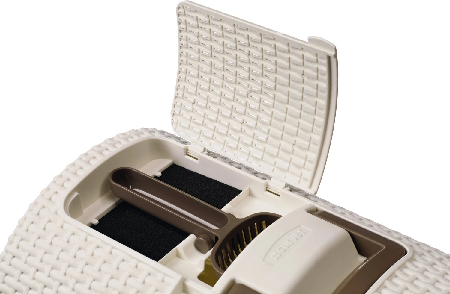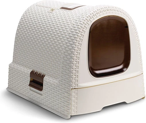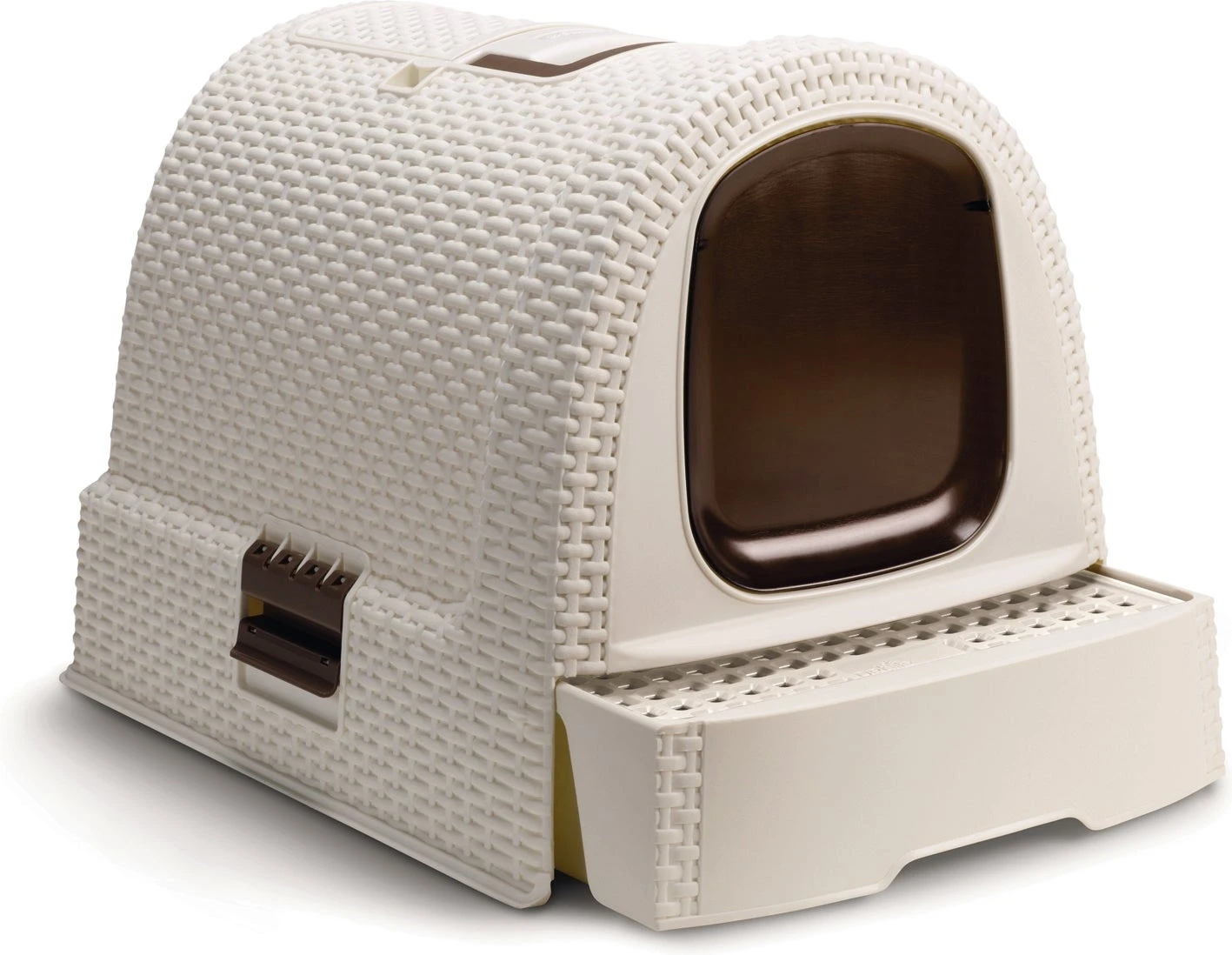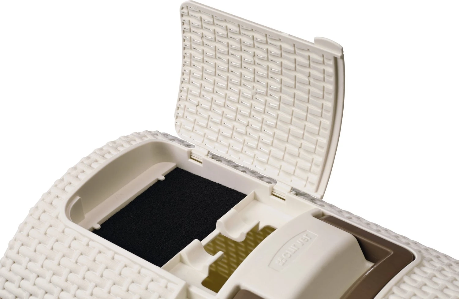 Een schitterend uitziende design kattentoilet van het merk Curver. Dit kattentoilet is van het oersterke materiaal Rattan, gemaakt van een hoogwaardig gevlochten kunststof. Voorzien van een plateau met gaatjes wat er voor dient, dat wanneer jouw kat van het toilet komt, hij of zij een deel van het kattengrit onder de poten al kwijt is. Tevens een handige uitschuifbare lade, zodat je in een oogopslag kunt zien of het kattentoilet al aan verschoning toe is. Een aanwinst voor elk interieur. Kleur: wit.