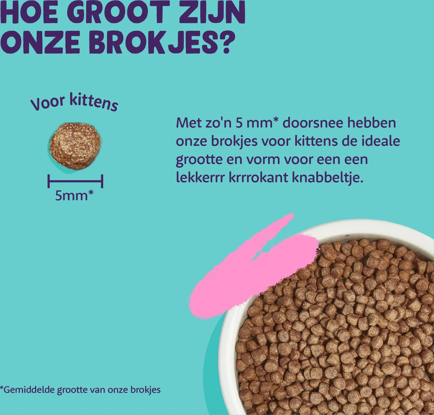 Kijk maar hoe je kitten zijn pootjes en snorharen aflikt na een portie van onze krokante brokjes. Mi-wauw!