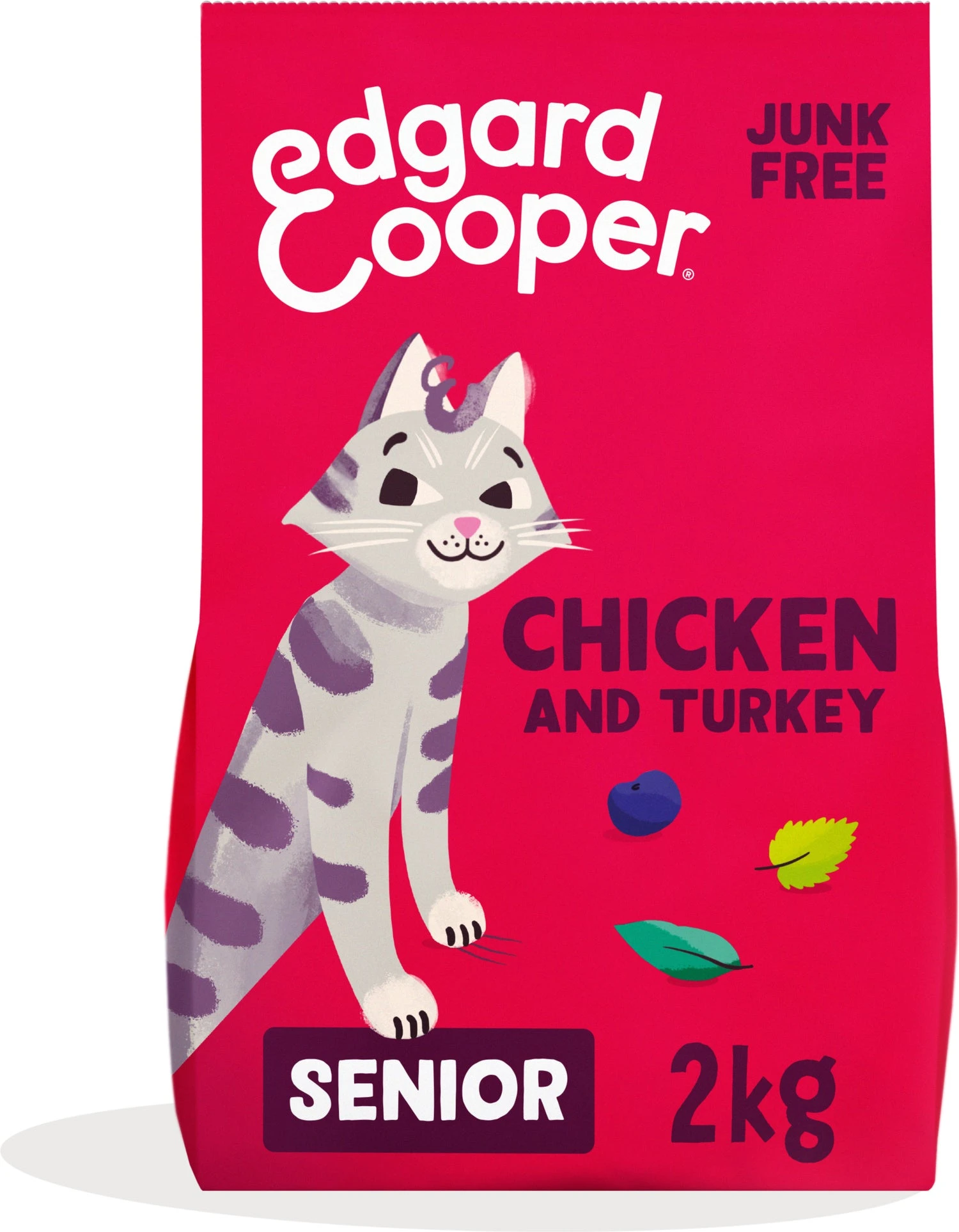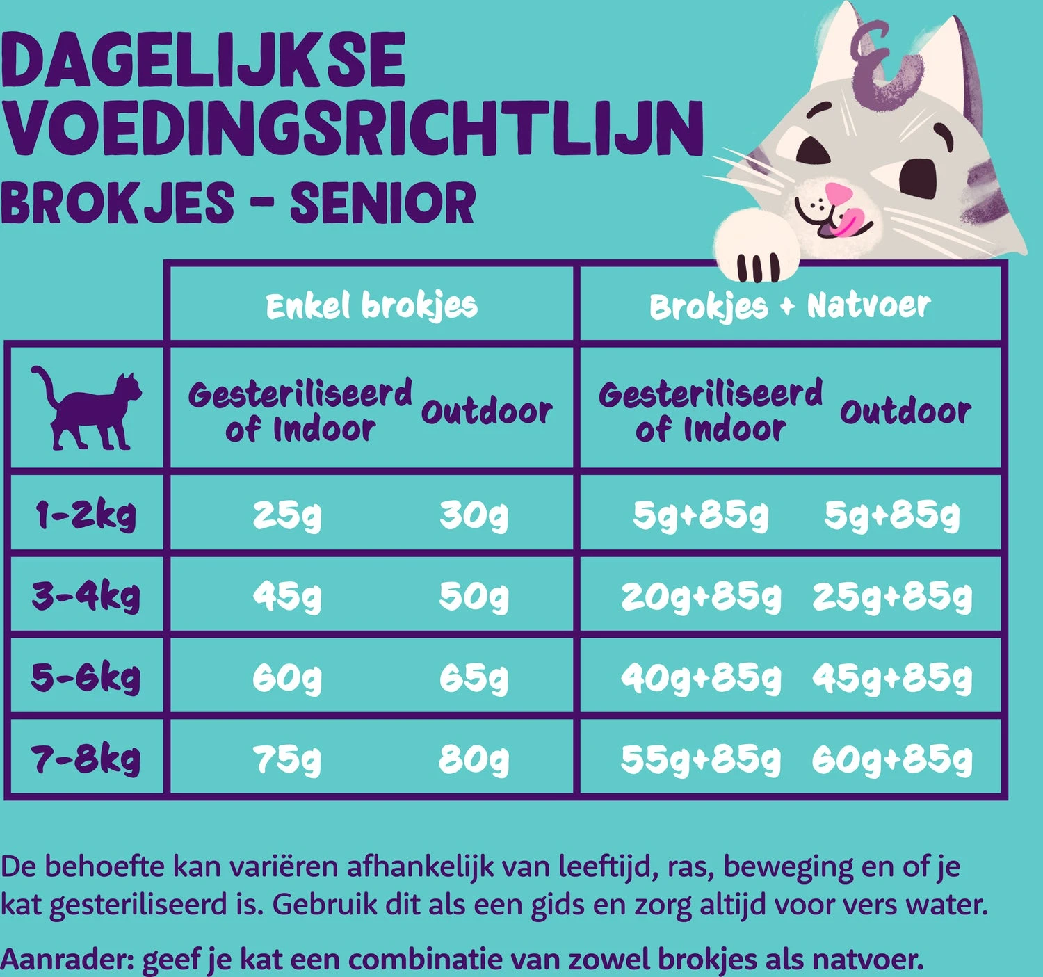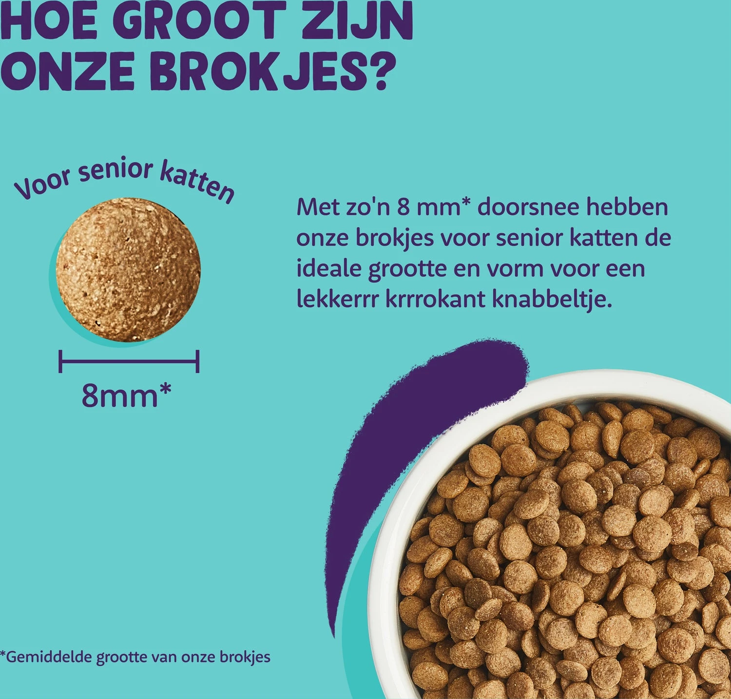 Onze krokante brokjes met vrije-uitloopkip en kalkoen bevatten alles wat je senior nodig heeft voor een spinnende oude dag. Ze zitten boordevol vers vlees zonder kunstmatige of tot poeder verpulverde rommel en zonder toegevoegde suiker. Écht eten zonder junkfood dus, waar je kat nooit genoeg van krijgt.