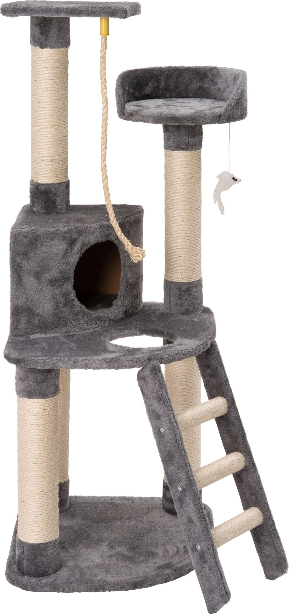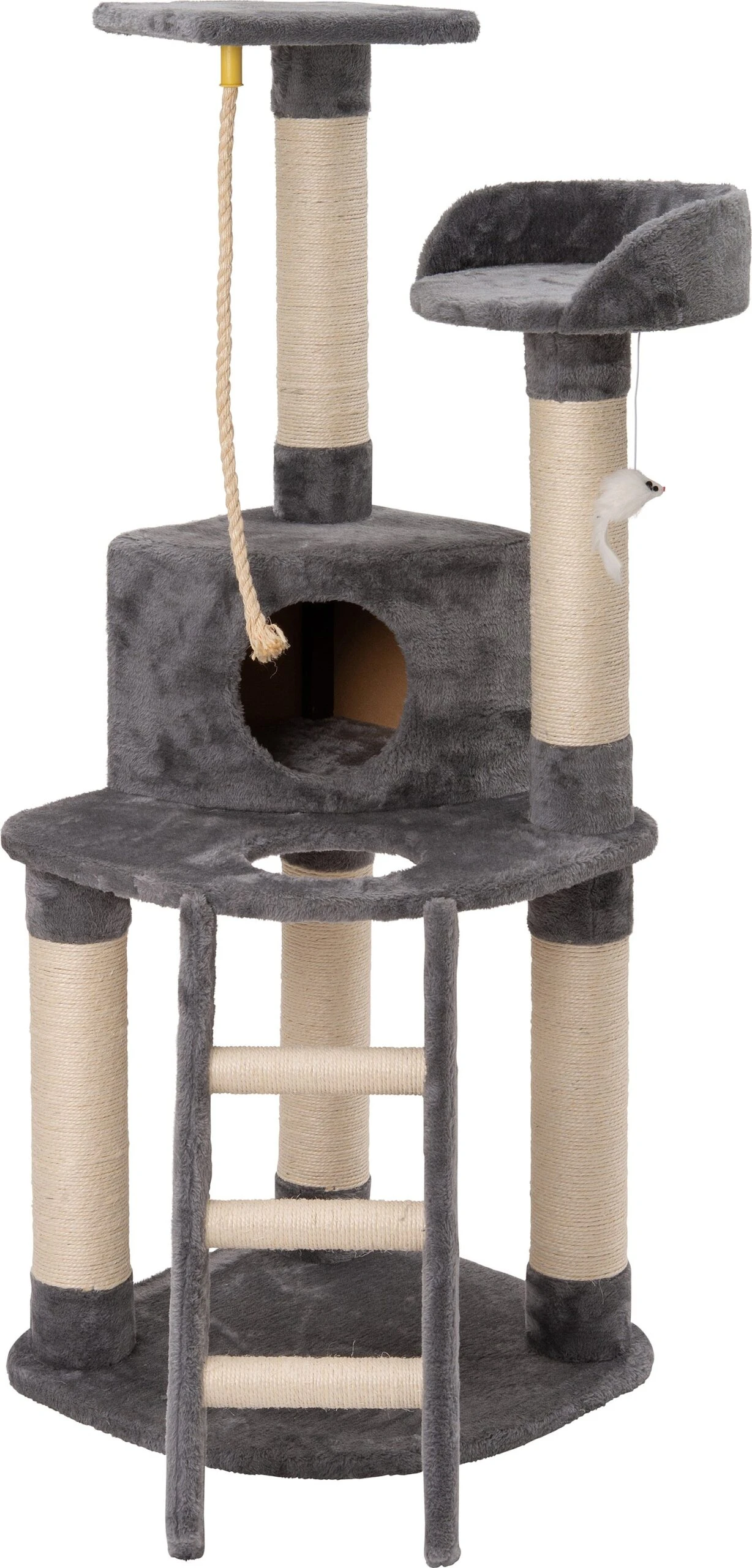 Krabpaal Evi van Intratuin is niet zomaar een krabpaal, het is een heel speel- en rustparadijs voor jouw kat. Het heeft twee hoge plateaus, aan de één hangt een touw en aan de andere hangt een muisje waar jouw kat mee kan spelen. In het midden zit een groot plateau met een dichte kattenmand, maar pas op voor de opening zit een gat, dat wordt een leuke uitdaging voor jouw kat! Door het pluche materiaal is het ook nog eens heerlijk zacht.