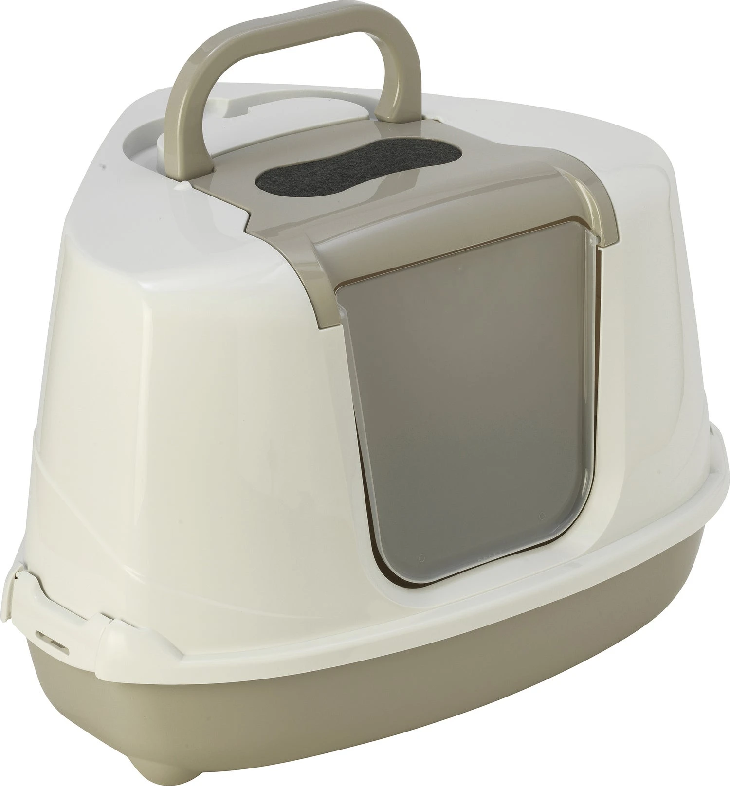Kattenbak Flip Corner van Moderna is een mooi vormgegeven kattentoilet voor in een hoek, met de afmetingen 45,1 x 55,7 x 38,2 cm. De naar boven openklapbare deur zal het dagelijkse schoonmaken van de kattenbak eenvoudiger maken.