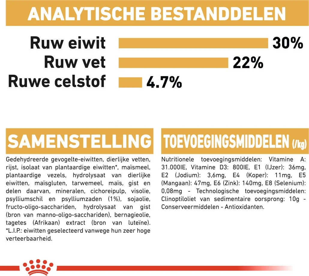 Door hun lange vacht zijn Perzische katten gevoelig voor de vorming van vervelende haarballen. Een specifieke combinatie van vezels in Royal Canin Persian Adult bevordert de uitscheiding van haren via de ontlasting en beperkt zo de vorming van haarballen. Goed verteerbare eiwitten (L.I.P), prebiotica en omega 3 vetzuren in de voeding ondersteunen de spijsvertering en een gunstige darmflora wat de kwaliteit van de ontlasting helpt verbeteren.